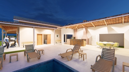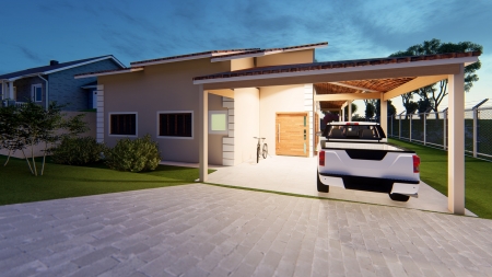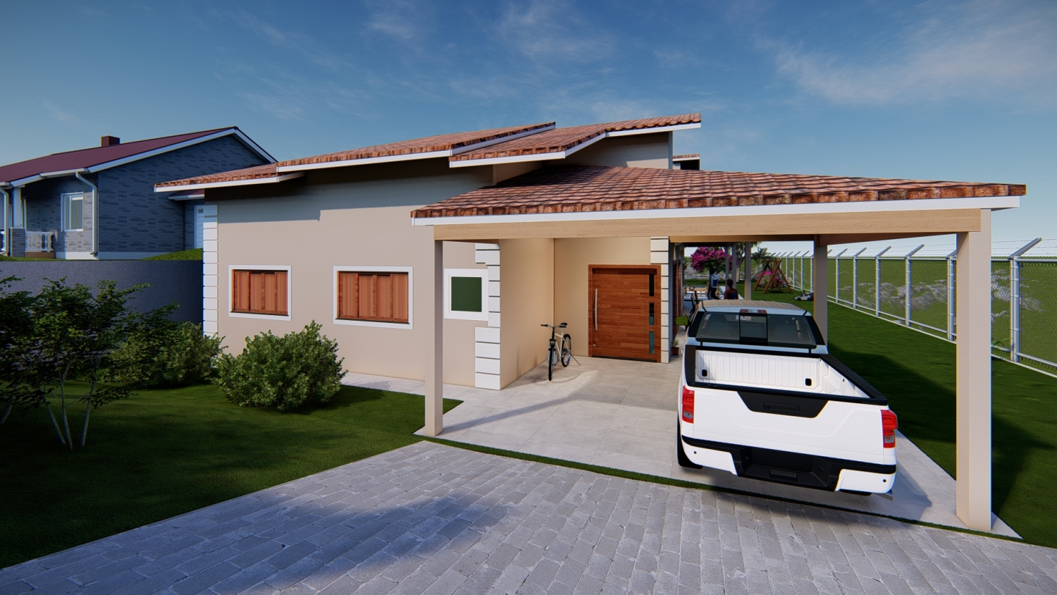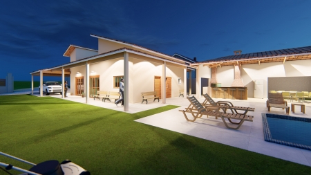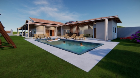 Projeto Residencial de Chácara em Pinhalzinho, Com 3 Suítes (uma sendo Master), Escritório, Sala de Jantar, Sala de Estar, Cozinha, Ampla Área Gourmet, Piscina, Toda Avarandada.